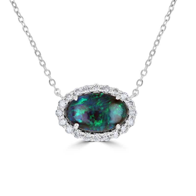 black opal freeform halo necklace. 14kw